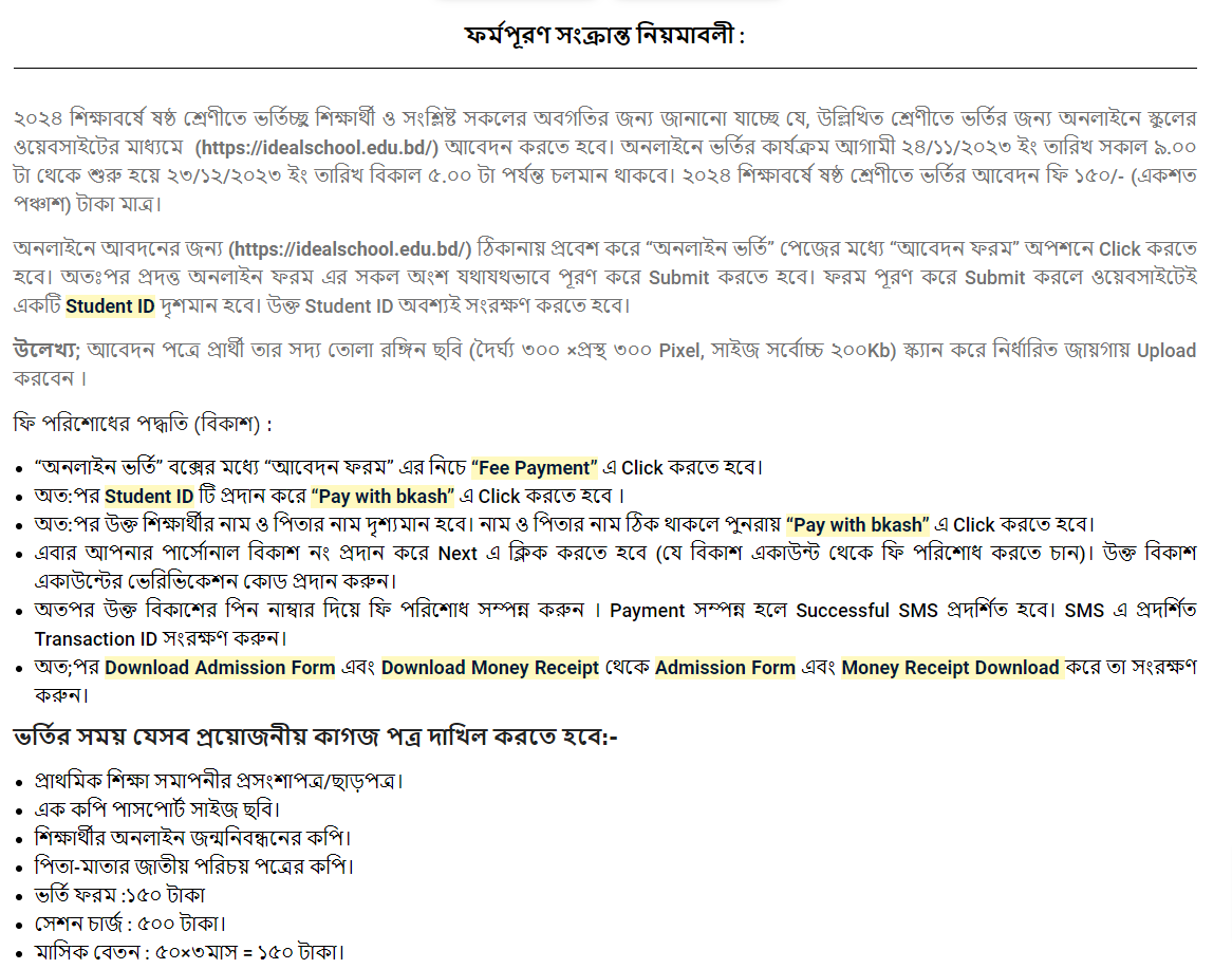 ২০২৪ শিক্ষাবর্ষে ষষ্ঠ শ্রেণীতে ভর্তিচ্ছু শিক্ষার্থী ও সংশ্লিষ্ট সকলের অবগতির জন্য জানানো যাচ্ছে যে, উল্লিখিত শ্রেণীতে ভর্তির জন্য অনলাইনে স্কুলের ওয়েবসাইটের মাধ্যমে (bailyschool.com) আবেদন করতে হবে। অনলাইনে ভর্তির কার্যক্রম আগামী ২৪/১১/২০২৩ ইং তারিখ সকাল ৯.০০ টা থেকে শুরু হয়ে ২৩/১২/২০২৩ ইং তারিখ বিকাল ৫.০০ টা পর্যন্ত চলমান থাকবে। ২০২৪ শিক্ষাবর্ষে ষষ্ঠ শ্রেণীতে ভর্তির আবেদন ফি ১৫০/- (একশত পঞ্চাশ) টাকা মাত্র।